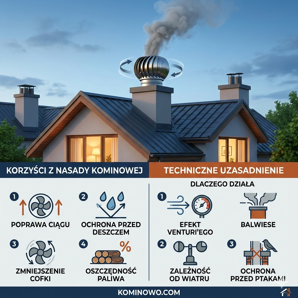 Nasada kominowa może poprawić stabilność ciągu w trudnych warunkach wiatrowych, ale nie zastąpi prawidłowego projektu komina. Jej montaż powinien być poprzedzony analizą wysokości, średnicy i zgodności z wymaganiami technicznymi instalacji.