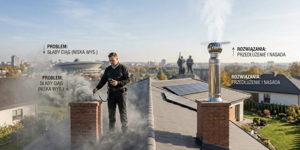 W domu parterowym niska wysokość komina może być wyzwaniem, ale nie musi oznaczać problemów. Prawidłowe wyprowadzenie ponad dach, odpowiednia średnica i zgodność z wymaganiami technicznymi pozwalają zapewnić stabilny ciąg i bezpieczną eksploatację instalacji grzewczej.