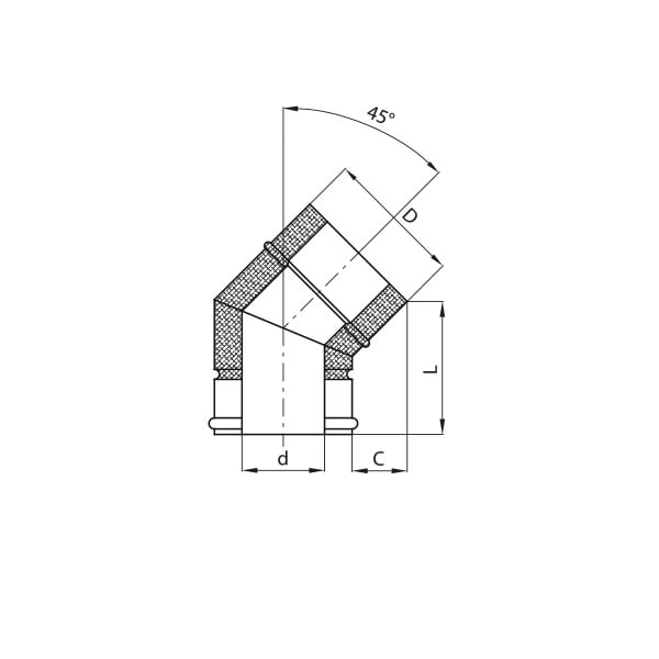 Element izolowany stosowany w celu zmiany kierunku przepływu spalin przy przyłączu kotła. Kąt 45 st.