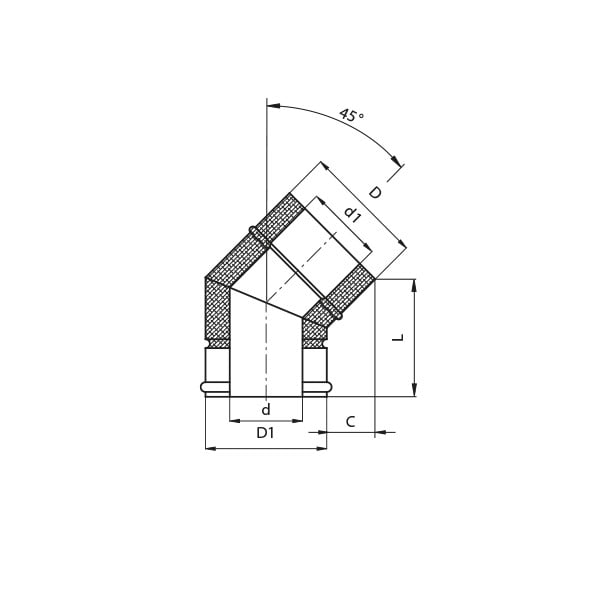 Element izolowany stosowany w celu zmiany kierunku przepływu spalin przy przyłączu kotła. Kąt 45 st.