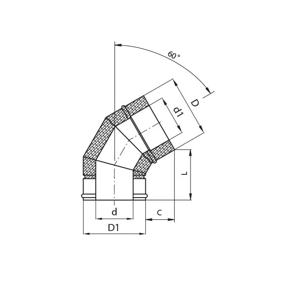 Element izolowany stosowany w celu zmiany kierunku przepływu spalin przy przyłączu kotła. Kąt 60 st.