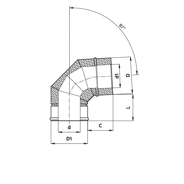 Element izolowany stosowany w celu zmiany kierunku przepływu spalin przy przyłączu kotła. Kąt 87 st.