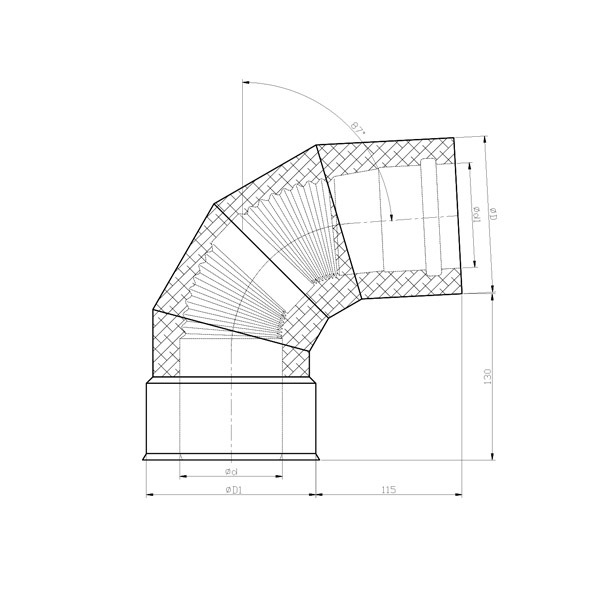 Element izolowany stosowany w celu zmiany kierunku przepływu spalin przy przyłączu kotła. Kąt 87º.