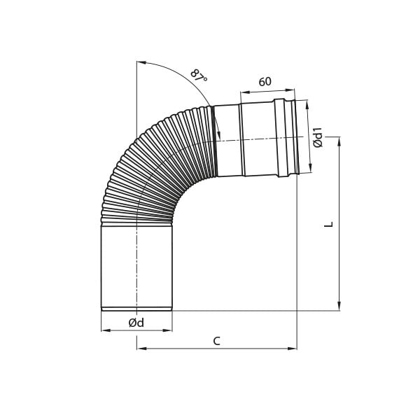 Element stosowany w celu zmiany kierunku przepływu spalin przy przyłączu kotła. Kąt 87 st.
