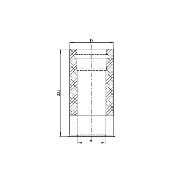 Rura okrągła izolowana, spawana techniką plazmową, służąca do budowy odcinków prostych komina. Elementy łączone dzięki kielichowym końcówkom (60 mm –mufa). Długość 0,25m.