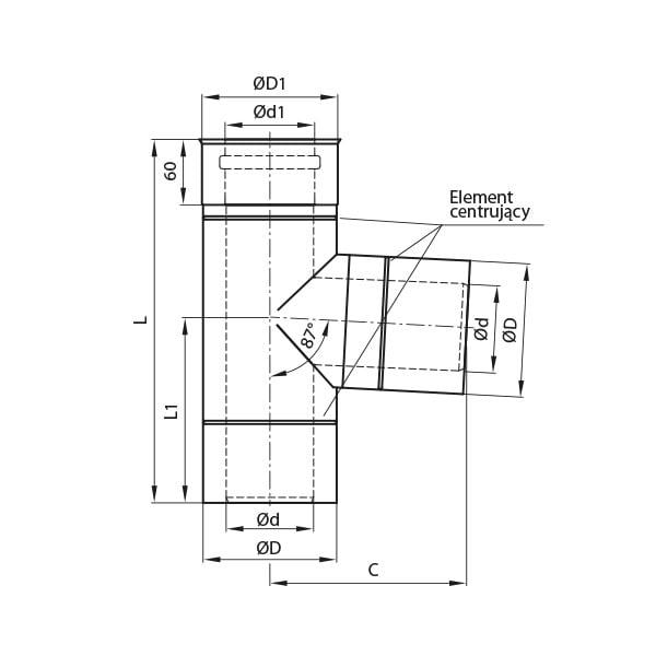 Element służący do podłączenia czopucha czy wyjścia z kotła pod odpowiednim kątem z pionowym odcinkiem wkładu kominowego. Kąt podłączenia 87 st.